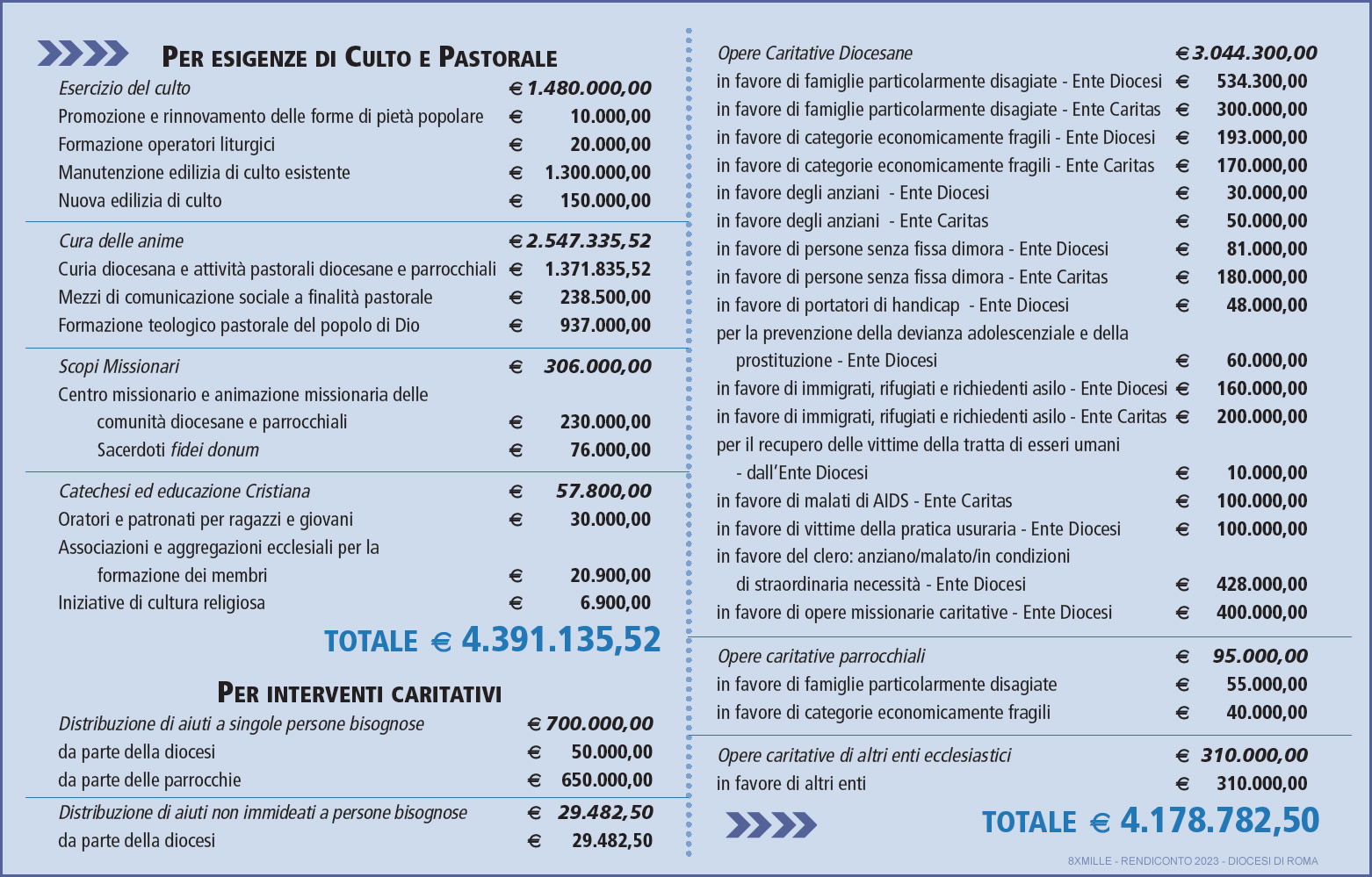 La somma erogata “per esigenze di culto e pastorale” ammonta invece a 4.391.135,52 euro. La quota dell’8xmille è stata distribuita tenendo conto di diverse esigenze importanti: «esercizio del culto; cura delle anime; formazione del clero e formazione teologico pastorale del popolo di Dio; scopi missionari; catechesi ed educazione cristiana». Le somme per l’esercizio del culto, afferma l’economo del Vicariato di Roma, «sono state destinate alla formazione di operatori liturgici, alla costruzione di nuovi complessi, e ad opere conservative e di restauro di parrocchie, chiese ed edifici di culto appartenenti alla diocesi».