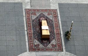 Indimenticabile anche il momento in cui incensò il feretro, davanti alle 300mila persone che riempivano la piazza. Più di 200 i capi di Stato e di governo presenti. Due milioni le persone in tutta Roma ad assistere sui maxischermi. Il discorso del cardinale Ratzinger venne interrotto dagli applausi per tredici volte. Parlò per venti minuti e verso la fine sollevò il braccio per indicare l’appartamento papale, prima di aggiungere: «Possiamo essere sicuri che il nostro Papa sta adesso alla finestra della casa del Padre, ci vede e ci benedice». Il funerale si concluse con gli applausi, mentre alle 12.30 i sediari pontifici rivolsero per l’ultima volta verso la piazza il feretro con il simbolo mariano. Il coro “Santo Subito” passava di voce in voce come una sorta di profezia, portata a compimento il 27 aprile 2014 da Papa Francesco davanti ad almeno 800mila fedeli.