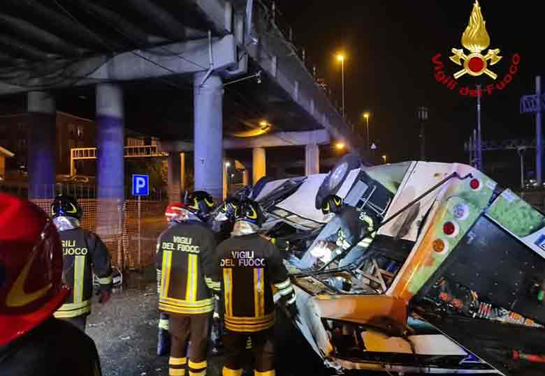 Ancora da chiarire la dinamica dell’incidente avvenuto ieri sera, 3 ottobre, a Mestre: poco prima delle 20 un pullman di turisti – molti stranieri di diverse nazionalità – diretti a un camping di Marghera è precipitato dal cavalcavia della bretella che da Mestre porta verso Marghera e l’autostrada A4, facendo un volo di circa 30 metri. Il pullman, per motivi che vanno ancora accertati, ha sfondato il parapetto del cavalcavia della Vempa ed è precipitato tra un magazzino e i binari della stazione di Mestre, incendiandosi. Il bilancio, per ora, è di 21 morti, tra cui 2 bambini, e 18 feriti – 3 i minori -, di cui 5 molto gravi a causa di ustioni e politraumi. Alcune delle prime vittime recuperate sarebbero morte carbonizzate.