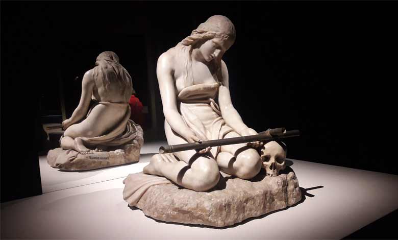 Il percorso si avvale di specchi, piedistalli girevoli e ricercate soluzioni illuminotecniche, che rievocano la calda atmosfera a lume di torcia con cui l’artista, secondo un’usanza di fine Settecento, mostrava le proprie opere agli ospiti di notte, nel suo atelier di via delle Colonnette, per svelarne a poco a poco la bellezza. Alla conclusione, una “mostra nella mostra”: le fotografie del maestro Mimmo Jodice esaltano, con taglio inedito, particolari delle opere più note, rivelatori di una delicatissima e commovente poeticità, che ha reso inarrivabile l’arte di Canova e che predispongono il visitatore ad entrare nell’ultima sala, dalle pareti con specchi, e ammirare la “Danzatrice”. Opera, sul suo piedistallo girevole, che fa rivivere l’emozione di Pigmalione nel vedere animarsi Galatea, non più marmo, ma carne. A definire la trama del racconto espositivo importanti prestiti, provenienti anche dall’Ermitage di San Pietroburgo e dai Musei Vaticani. Tra le opere, la “Maddalena penitente”, esempio illustre di arte “patetica” e “Amorino alato”.