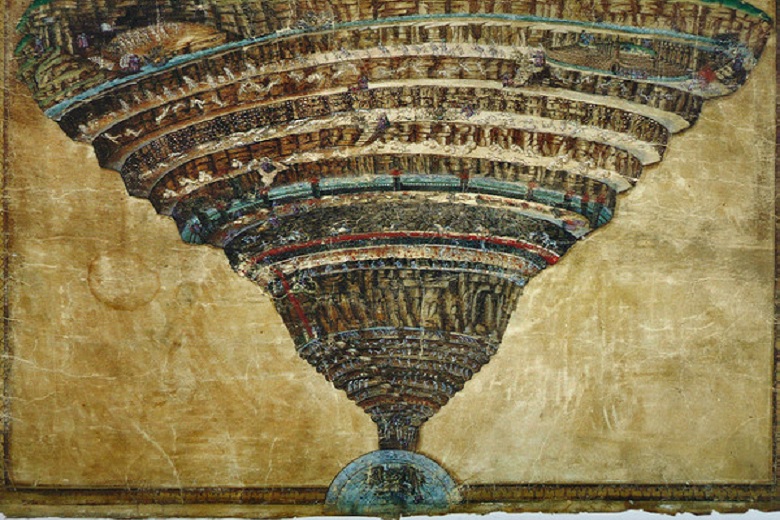 Varcata “La porta dell’Inferno”, fusione in gesso realizzata in scala 1:1 da Rodin che, insieme alla “Caduta degli angeli” di Andrea Commodi, è l’unica opera che ha la bianca luminosità del marmo, il visitatore ammirerà la “Voragine infernale”, mirabilmente raffigurata su pergamena da Sandro Botticelli, in mostra grazie a una speciale concessione della Biblioteca Apostolica Vaticana. Dalla penombra emergono capolavori del Beato Angelico, Cezanne, Bosh, Brueghel, Balla e altri artisti, e non poteva mancare una tela di grandi dimensioni del più famoso illustratore della Commedia, Gustavo Doré. Sono opere che documentano la persistenza dell’iconografia del mondo dei dannati dal medioevo ai nostri giorni. Pregevoli le miniature medievali osservate dal visitatore dapprima con noncuranza, come se fossero dei distrattori rispetto a dipinti e sculture, poi con stupore nel constatarne la bellezza, apprezzabile anche dai non addetti ai lavori. Ad esse si aggiungono esempi di esorcizzazione della paura del diavolo, ridotto a maschera, come nella commedia dell’arte, rappresentata dal Teatrino napoletano con i pupi siciliani (catanesi e palermitani). Non meno commoventi gli inferni di guerra, sterminio e alienazione dell’uomo moderno.