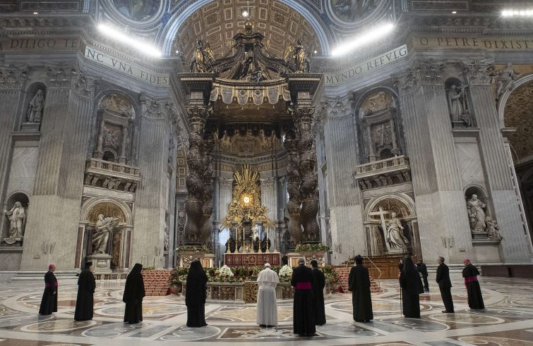 L’inizio davanti all’Altare della Confessione, nella basilica vaticana, con i leader delle Chiese cristiane, quindi la sosta davanti alla tomba di Pietro