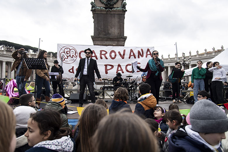 Il messaggio letto da uno dei 2mila partecipanti alla Carovana della pace, affacciato accanto al Papa dopo l’Angelus. La Messa alla Chiesa Nuova, poi la marcia fino a San Pietro. Il saluto di Reina, che ai piccoli ha chiesto 3 regali: «La pace, la speranza e la gioia»