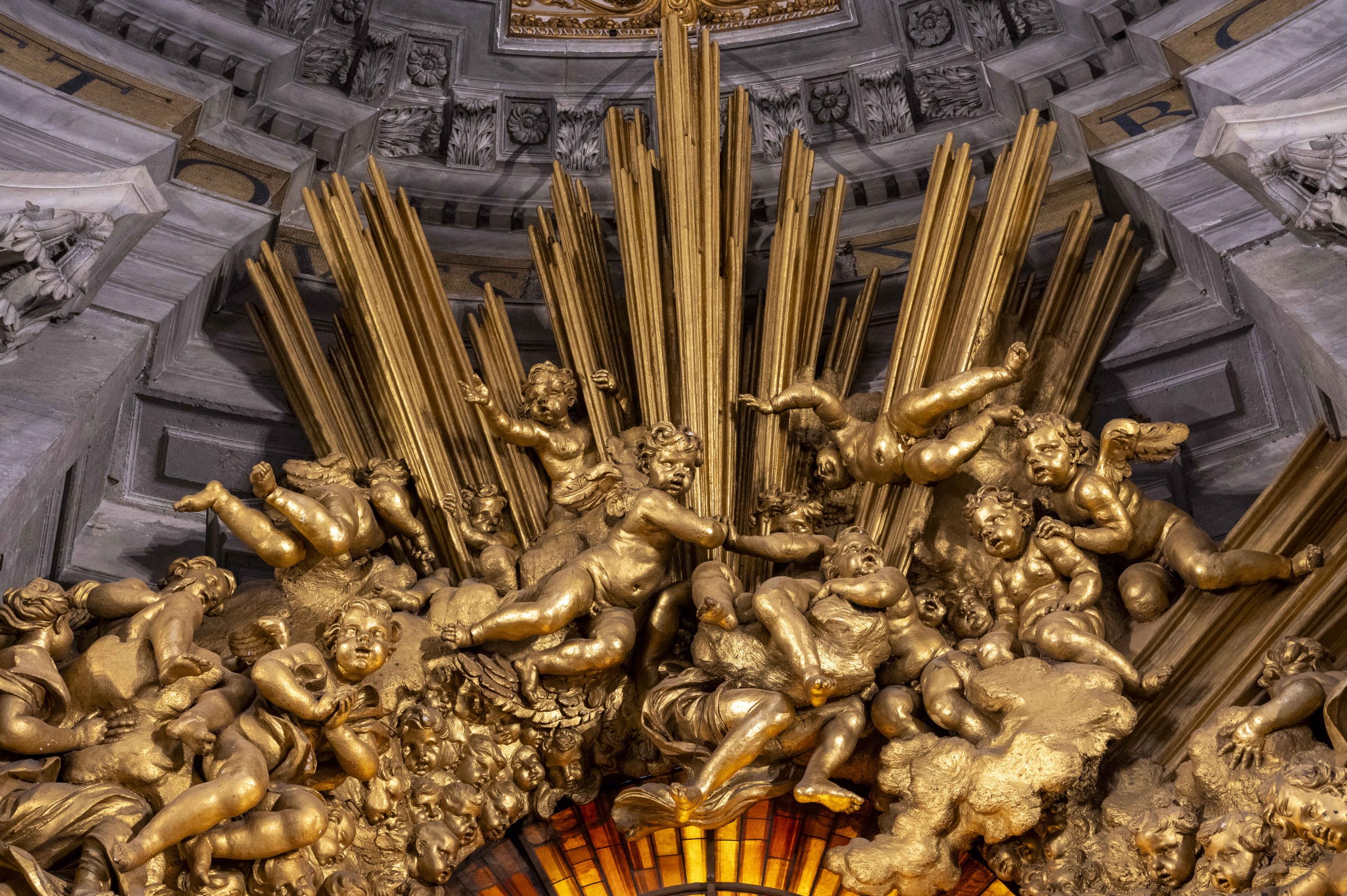 Sulle colonne di circa 11 metri quattro capitelli di bronzo e su questi una trabeazione con quattro angeli, anch’essi di bronzo, alti 4,5 metri, sembrano sorreggere con quattro ghirlande, quattro giganteschi costoloni che svettano verso l’alto e si inerpicano verso il centro dove c’è un’altra struttura sulla quale è montata la croce sul globo.