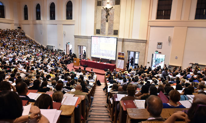 L’Aula magna della Pontificia università San Tommaso d’Aquino è gremita. Perlopiù giovani sono quelli che, in questo venerdì 26 settembre, siedono ai banchi in attesa che inizi il convegno “Cantare la Fede” che, tra i relatori, ha alcuni tra i più importanti esperti di musica liturgica come monsignor Vincenzo De Gregorio, preside del Pontificio istituto di Musica sacra, e padre Jordi A. Piquè, preside del Pontificio Istituto liturgico Sant’Anselmo. L’arrivo del cardinale vicario, Agostino Vallini e dell’ideatore dell’evento, monsignor Marco Frisina, trasforma la calma platea in un pubblico da stadio. Tutti in piedi ad acclamare con urla di gioia e applausi scroscianti i protagonisti dell’incontro, nato in occasione dei 50 anni dalla Costituzione Conciliare “Sacrosanctum Concilium” e del 30° anniversario del Coro della Diocesi di Roma per fare il punto sullo stato di salute della musica liturgica. L’aula dell’Angelicum che accoglie circa 1500 delegati in rappresentanza delle cappelle musicali italiane, di Spagna, Portogallo, Brasile e Turchia è in festa per un musicista che non è Vasco o Ligabue ma un sacerdote sessantenne: il maestro Marco Frisina, a cui il cardinale Vallini riconosce il merito di essere «il vero e instancabile animatore» del Coro della diocesi di Roma, da lui fondato e diretto sin dal 1984 e composto attualmente da oltre 250 elementi.