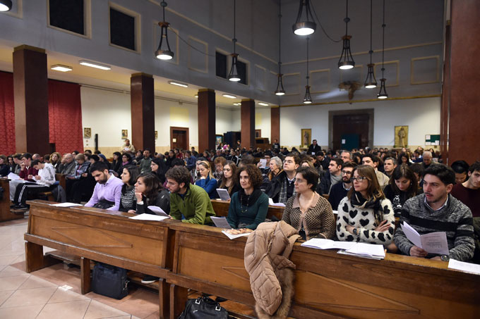 «Questa è la serata del coraggio perché pronunciamo la parola “fratello” in un tempo rosso di sangue e vendetta. Dove “fratello” è una parola bucaneve che nel cuore dell’inverno minutamente fora il gelo e fiorisce, annunciando la primavera che verrà. È una profezia e insieme una speranza, quella che noi stasera torniamo a pronunciare nel cuore del nostro inverno». È sabato sera, e la parrocchia di San Pio V è gremita di centinaia di giovani e adulti riuniti per la Veglia della Pace, secondo appuntamento promosso dall’Azione Cattolica per riflettere, come ogni gennaio, sull’impegno per la pace partendo dal messaggio di Papa Francesco, che quest’anno ha come tema “Non più schiavi ma fratelli”.