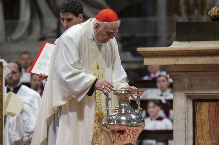Nella Messa sono stati benedetti gli oli santi che saranno utilizzati per amministrare i sacramenti. Per primo l’olio degli infermi, usato per l’unzione dei malati, poi l’olio dei catecumeni utilizzato nei battesimi e infine l’olio per il Santo Crisma, misto a profumo, usato per amministrare i battesimi, le cresime, nelle ordinazioni presbiteriali ed episcopali, nelle consacrazioni delle chiese e degli altari. «Sono per la consolazione del popolo di Dio e per la gioia messianica – ha concluso il Papa -. Il campo è il mondo. La nostra casa comune, tanto ferita, e la fraternità umana, così negata, ma incancellabile, ci chiamano a scelte di campo. Il raccolto di Dio è per tutti: un campo vivo, in cui cresce cento volte più di quello che si è seminato».