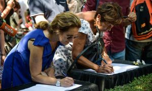 In tanti hanno semplicemente scritto “Grazie!”, perché «parlava al cuore della gente», dice Federica, 30 anni. «Una sua citazione, ripetuta anche questi giorni, mi è sempre rimasta impressa – aggiunge Valeria -: “Non bisogna mai avere paura dell’altro perché tu rispetto all’altro sei l’altro”, diceva il maestro. Aveva ragione». Al suo arrivo il sindaco di Roma Virginia Raggi non ha escluso che ad Andrea Camilleri venga riconosciuta la cittadinanza onoraria. «Credo che potrebbe essere una grande idea – ha detto entrando al cimitero -. Roma e l’Italia intera hanno amato il maestro Camilleri. Ha avuto il merito di descrivere nei suoi romanzi quello che è un po’ l’italianità». Ammettendo di aver avuto «una passione infinita» per lo scrittore siciliano, il sindaco ha voluto ringraziare anche la famiglia per la scelta di lasciarlo a Roma. «Credo che il fatto di voler rimanere qui sia un grande atto di amore nei confronti della città – ha concluso -. E noi speriamo che tutti possano passare da qui per fargli un saluto». Anche il vice sindaco Luca Bergamo negli anni è stato conquistato dagli scritti di Camilleri. «I miei ricordi a lui sono tutti legati alle sue pagine», ha detto prima di rendere omaggio allo scrittore.