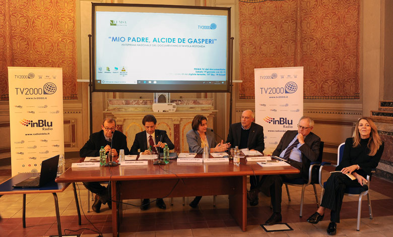 Alcide De Gasperi, primo segretario del Partito Popolare dopo l’amico don Luigi Sturzo, che il 18 gennaio 1919 con l’Appello ai liberi e forti dava vita al partito, per il rettore della Lumsa Francesco Bonini può essere definito «uno e trino. La sua vita è caratterizzata dall’attenzione alla società, al governo e alla fede». Mentre Gianfranco Astori, consigliere del Presidente della Repubblica, ha descritto lo statista come l’uomo che «scrisse la grammatica della democrazia repubblicana». Il documentario, ha spiegato il direttore di Tv2000 Vincenzo Morgante, vuole mettere in evidenza «il ruolo dei cattolici in politica intesa come servizio, con uomini che hanno fatto del rigore, della sobrietà, dei valori della libertà e della solidarietà, della coerenza e della fede un impegno di vita».