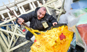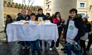 La mattinata di festa, fin dalle 8, era iniziata nella chiesa di Santa Maria in Vallicella, in piazza della Chiesa Nuova, per la celebrazione eucaristica; a presiederla, il vescovo Gianpiero Palmieri, ausiliare per il Settore est e assistente diocesano Acr negli anni ’90, che aveva fatto osservare ai più giovani come «quando avviene l’incontro vero con Gesù nessuno resta tale e quale: tutta la vita cambia e cambiano i cinque sensi che, illuminati dallo Spirito Santo, ci rendono capaci di riconoscere e “gustare” la presenza di Dio ovunque». Lo slogan della Carovana infatti è stato proprio “Sapore di pace” e ha voluto stimolare i più piccoli a scoprire un “gusto tutto nuovo”, quello che si sperimenta quando, ciascuno secondo le proprie capacità e possibilità, si spendono energie, impegno e servizio a favore dei più bisognosi. Per questo, dopo la Messa, bambini e ragazzi, insieme a educatori e genitori, si sono messi in marcia reggendo prototipi di pentole, torte e tavole imbandite: all’interno erano installati i salvadanai con le offerte raccolte per sostenere il progetto di solidarietà dell’Azione cattolica italiana che quest’anno incontra la Focsiv (Federazione degli organismi cristiani servizio internazionale volontariato) con l’iniziativa “Abbiamo riso per una cosa seria”, che promuove l’agricoltura familiare in Italia e nei Paesi del Sud del mondo.