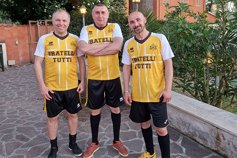 Dodo Chierico, che ha vinto lo scudetto con la Roma nel 1982-83, allena “Fratelli tutti”: «Sono partite di fratellanza per mandare un messaggio di pace attraverso il calcio. Questa squadra è ancora in allestimento. Prima di tutto cerco di creare entusiasmo e farli sentire un gruppo aperto con giocatori di ogni età». Vestono le maglie gialle di “Fratelli tutti” anche Boris, Jury e Andrij, ucraini. Padre Andrij Maksymouych è in Italia da due anni, viene da un centro vicino a Leopoli: «Da piccolo giocavo a calcio. Ora mi rendo conto che lo sport per me è parte integrante dell’esercizio del sacerdozio perché fa crescere le persone in modo integro e valorizza le diversità». Del suo popolo dice che «sta offrendo testimonianza di dignità e libertà, di rispetto delle radici. Combattono per la libertà di tutti i popoli». Per lui e per gli altri ucraini in squadra la partita è servita per prendere forza.