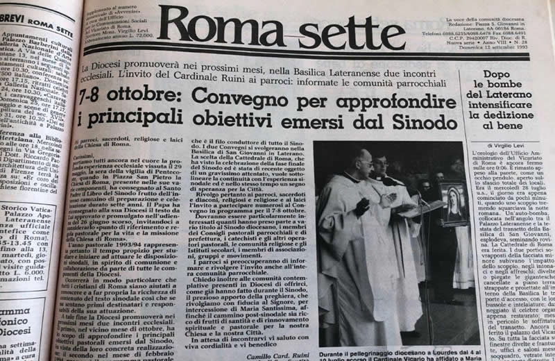 Alle esplosioni del male i cristiani rispondono con un accresciuta dedizione al bene. Il grave episodio di quest’estate non solo non indebolirà lo slancio venuto alla Diocesi dalla celebrazione e conclusione del Sinodo, ma piuttosto lo accrescerà, rendendo più saldi i vincoli di fraternità e comunione dei fedeli e delle Parrocchie, tra loro e con il Vescovo e i Pastori che collaborano con lui. L’impegno per una nuova evangelizzazione della Città trova, nei fatti del Laterano, una ragione in più: testimoniare con maggiore impegno la parola di Cristo nella vita e nelle iniziative pastorali, affinché il male sia sconfitto dalla vittoria del bene. (di Virgilio Levi)