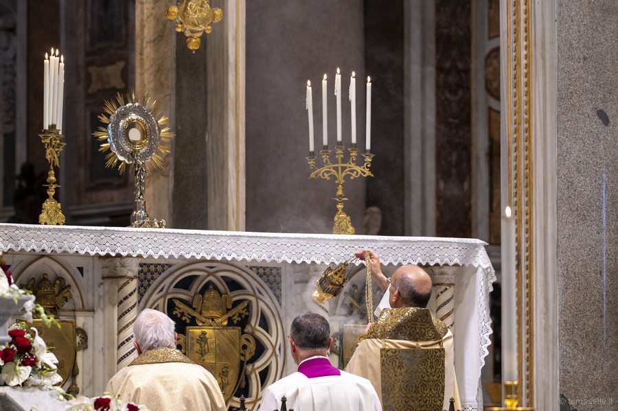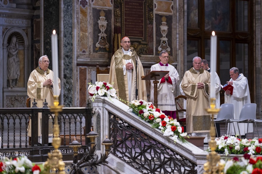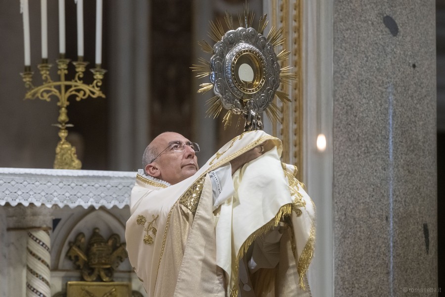 Il cielo è ancora azzurro quando dal fondo della basilica si intravede la croce della processione. L’ultima luce del giorno entra dalla porta principale di San Giovanni in Laterano. Il cardinale vicario Baldo Reina percorre lentamente la navata centrale, sale sull’altare e prende la parola non appena la musica del Coro della diocesi di Roma si interrompe dolcemente. «Fratelli e sorelle – esordisce -, nel silenzio adorante di questa sera, eleviamo il nostro rendimento di grazie al Signore per il dono grande della vita di Papa Francesco». Poi si inginocchia mentre viene esposto il Santissimo, lo incensa con il turibolo, e rimane in contemplazione per qualche minuto.