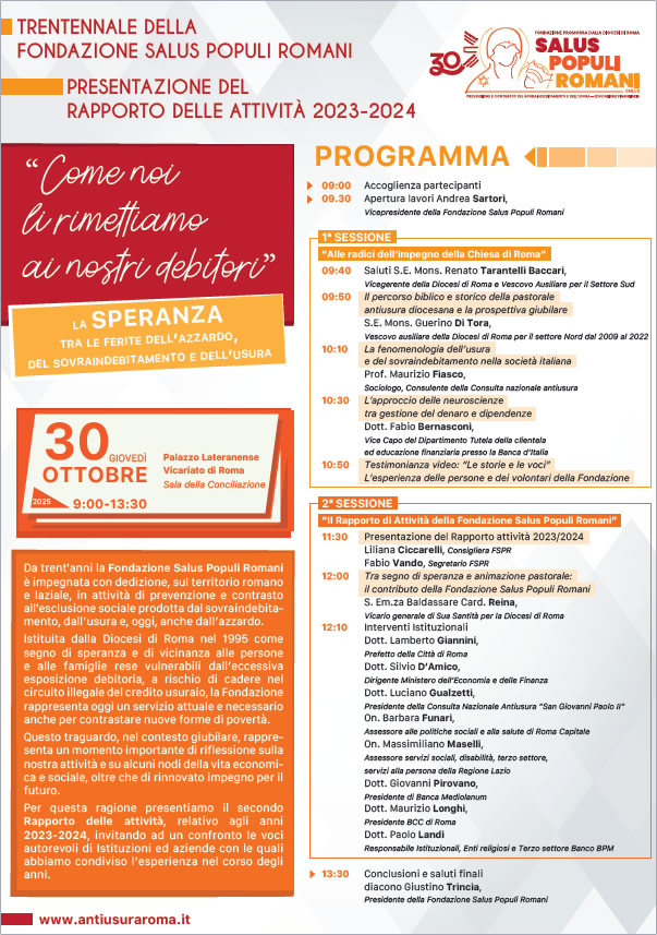 Compie 30 anni la fondazione “Salus Populi Romani”, promossa dalla diocesi di Roma per la prevenzione dell’usura e la gestione del sovraindebitamento. E “festeggia” con una conferenza, giovedì 30 ottobre dalle 9 alle 13 nell’Aula della Conciliazione del palazzo del Vicariato, in piazza San Giovanni in Laterano 6/a. “Come noi li rimettiamo ai nostri debitori”: questo il tema dell’incontro, a cui saranno presenti, tra gli altri, il cardinale vicario Baldo Reina, il prefetto di Roma Lamberto Giannini, i vescovi Renato Tarantelli Baccari, vicegerente della diocesi di Roma, e Guerino Di Tora, gli assessori alle politiche sociali di Roma Capitale Barbara Funari e della Regione Lazio Massimiliano Maselli.