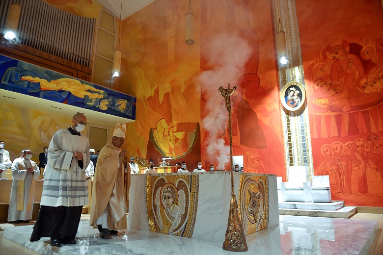 Il giallo, l’arancio e il rosso. Padre Marko Ivan Rupnik, l’artista gesuita fondatore del Centro Aletti, ha scelto di utilizzare prevalentemente i colori caldi per i dipinti che ornano le pareti della navata e dell’abside della Cappella maggiore del Pontificio Seminario Romano Maggiore dove ieri sera, 1° dicembre, il cardinale vicario Angelo De Donatis ha presieduto la Messa solenne di inaugurazione dell’ambiente rinnovato, con il rito di dedicazione del nuovo altare. «Ungere un altare non è una formalità ma significa preparare una mensa, un altare vivente – ha spiegato il porporato nella sua omelia -. Tutto qui converge verso Cristo, che dopo avere condiviso i pani dà se stesso come pane a voi, cari seminaristi che un giorno sperimenterete cosa significa essere consacrati al Signore, perché come lui possiate fare Eucaristia, distribuendo il pane e diventando voi per primi pane».