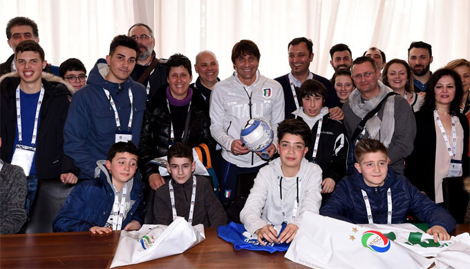 Medici e piccoli pazienti della “Squadra del cuore” in visita agli Azzurri di Antonio Conte, in ritiro in vista delle amichevoli con Spagna e Germania